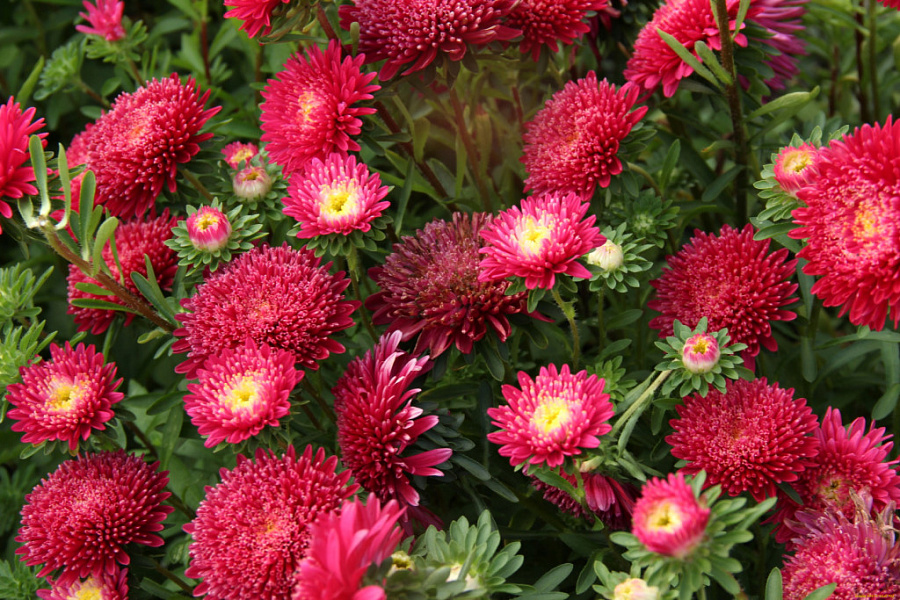 Астра Баронесса Красная - это великолепное растение, которое поразит вас своей красотой и изяществом. Ее стебель прочный и устойчивый, достигает высоты до 65 см, а диаметр цветка составляет 5-6 см. Цветки астры имеют ярко-красный оттенок, что придает им особую привлекательность. Листья растения имеют интересную форму, что делает его еще более уникальным.
