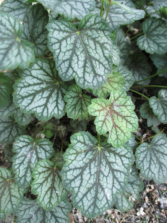 Рассада гейхеры Дэйл Стрейн (Dale Strain) поражает эффектным внешним видом. Поверхность листьев покрыта темными прожилками, контрастно выделяющимися на серебристо-зеленом фоне. В июле розетка выпускает стебель с зеленоватыми цветочками. Этот сорт применяют для украшения клумб, альпийских горок и водоемов.