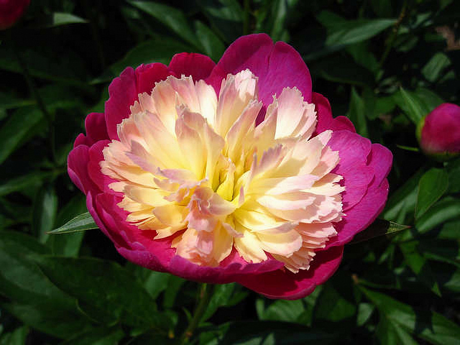Пион сорта Gay Paree (Гей Пари) является пионом с оригинальной японской формой соцветий. Его темные розовые лепестки хорошо выделяются на фоне бело-кремовой центральной части. Светлые зеленые листья подчеркивают необычность оттенка цветов. Диаметр цветка достигает 15 см.Стебли растения крепкие, а цветение обильное, сроки цветения среднепоздние. Когда наступает весна, оно нуждается в обильном, но нечастом поливе. Под каждый куст добавляется примерно 3 ведра воды для достаточного увлажнения грунта. Летом пиону Гай Пари нужен минимальный уход. После завершения цветения кустарник следует поливать, разрыхлять грунт и пропалывать его от сора, вносить удобрения.